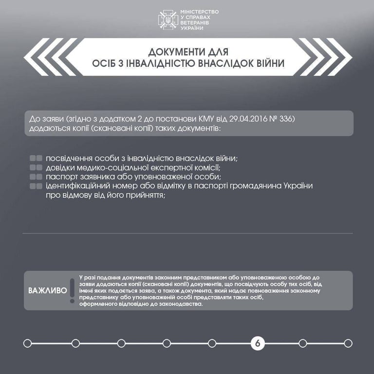 До заяви особам з інвалідністю внаслідок війни потрібно додати копії таких документів: