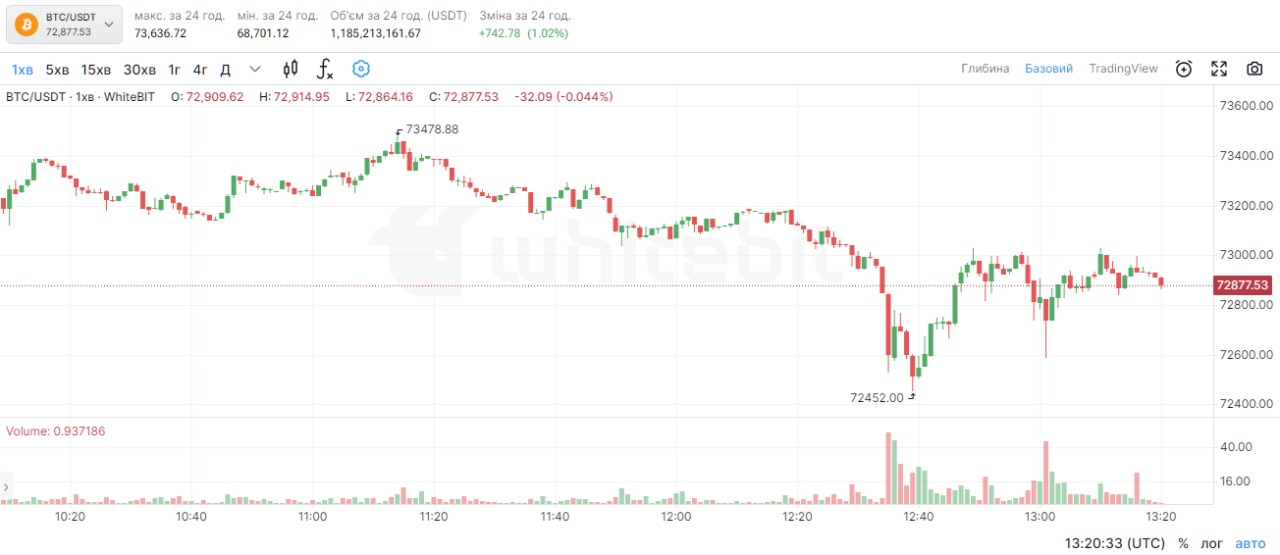 Bitcoin (BTC) — 72,877 тысячи долларов за монету;